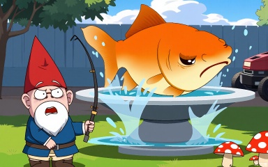 A startled garden gnome with a fishing rod screams as a giant goldfish leaps from a birdbath, water splashing, mushrooms fleeing in a backyard where rubber ducks pilot lawnmowers.