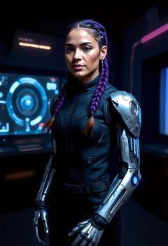 old toned female (XX) black american, dark skin, black eyes, character, Compact build, long dutch braid purple hair, ,, wearing nano-weave utility jumpsuit, cybernetic Retractable data ports on wrist augments, Chrome-plated cybernetic appendages with intricate circuitry details, metallic silver finish, glowing blue accents mechanical_arms, legs, arms and mechanical_legs, set in Portal Control Room, High-tech hub with holographic displays, complex equations, and a central console for managing interdimensional travel , at night, with mysterious lighting