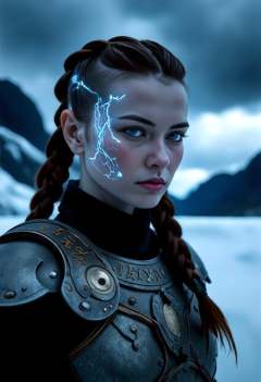 A captivating image emerges, focusing on a vikingpunk warrior-princess with her presence commanding attention in the icy wasteland. Her futuristic viking armor based on traditional viking armor, a seamless fusion of technology and her athletic form, slim-athletic form highlights her strength and agility. The warrior's twin braids with shaved sides, frames her determined expression, while her piercing eyes bore into the viewer. Ancient runes are etched into her battleaxe and armor, crackling with mystical glowing energy. The frozen landscape, a testament to her people's resilience, stretches into the distance, where dark, ominous clouds partially veil the rugged mountainous pass, filling the air with crispness and the promise of lightning. This artwork, with its Nordic and Viking-inspired elements, captures the essence of a powerful futuristic figure, seamlessly blending ancient traditions with futuristic innovations. Beauty, chiaroscuro, play of shadow and light, realistic,   <lora:flux_trainer/moxiePunk_v4D>