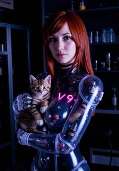 ******* photo, low-lit, overexposure, shot on a mobile phone, nighttime, noticeable noise in dark areas, a portrait of a very beautiful cyborg made of transparent glossy glass skin surrounded with glowing nixie tubes inside. "V9" is written in Nixie Tubes on her armor plate, she is holding a cute kitten to her breast, red hair, epic, dynamic pose, best lighting, the background is a dark science lab