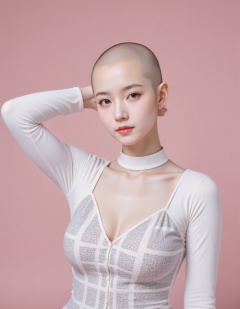 pl,pl,guangtou,1 women,close-up,Clothes **** of white newspaper,This is a high-resolution portrait of a modern style,featuring a young woman. She is wearing a tight dress white printed with English and patterns,the pattern of which resembles a newspaper. she has one hand resting on the back of her head while the other hangs naturally by her side. Her eyes are fixed on the camera,and her expression is calm. She appears to be between the ages of 20 and 30,slim in figure,with delicate features,and fair skin. Her eyes are brown,and her lips are tinted with a subtle shade of red lipstick. The image is a portrait of a young woman red lipstick. She is standing in front of a pink background and is posing with her hands behind her head. The woman is wearing a long-sleeved top with a plunging neckline and a black and white patterned design. The top has a high neckline with a deep V-neckline and long sleeves. she is looking directly at the camera with a serious expression. The overall mood of the image is serious and edgy.,