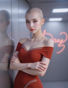 pl,pl,guangtou,1 women,In close - up photography,a woman with a cold and glamorous temperament wears a modified red off - the - shoulder cheongsam. The hem of the cheongsam is in an irregular zigzag shape and inlaid with shiny rhinestones. The woman is in a futuristic silver metal room,and abstract neon lights keep flashing on the wall behind her. She crosses her arms and looks cold,as if examining the unknown world.,