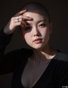 A close-up portrait of a woman with guangtou, partially illuminated by a narrow beam of light. She wears a black outfit, her hand covering part of her face, showcasing minimalistic rings on her fingers. Subtle makeup highlights her eyes and lips. Her contemplative expression is enhanced by dramatic shadows, creating an intimate composition. The color scheme uses dark tones and highlights, emphasizing emotional depth. The scene exudes an artistic and moody vibe, with the close-up angle intensifying the atmosphere. Keywords: guangtou, woman, close-up, dramatic lighting, intimate composition, moody vibe.