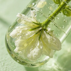 This is a close-up of a beauty brand advertisement, with green and white as the main colors. The picture shows the internal structure of the white tea petals. The white tea flower is placed in a transparent glass round glass tube, which is filled with light green liquid, and tiny water droplets can be seen in it. The background is light green and white, highlighting the details