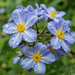 key-998-key, The image depicts several flowers with pale blue petals, featuring prominent water droplets on their surfaces. Each flower has five petals, arranged symmetrically around a central yellow disk. The petals are oval-shaped with a smooth edge and a slightly curved formation, giving them a delicate appearance. The contrast between the blue petals and the yellow center creates an attractive visual appeal.