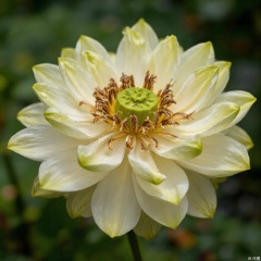 The center of the flower features a prominent seed pod that is green in color, round and slightly protruding. Surrounding the seed pod are delicate, often curved brown stamens. The flower appears to be fully open, showcasing its intricate structure.