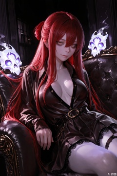 purple theme, pink theme, brown theme, black theme, grey theme, white, theme, violet theme, turquoise theme, maroon theme, gold theme, silver theme, kindred_lol, mask, furry female, body fur, Detailed Illustration, Realistic Style, Surrealism, HDR, High Contrast, masterpiece, best quality, photorealistic, ultra realistic details, detailed skin, 8k wallpaper, masterpiece, best quality, photorealistic, ultra realistic details, detailed skin, gothic, 1 girl , golden eyes , very long hair , long sidelocks, red hair ,half updo, petite , very cute , beautiful ,Straight hair, cool, handsome, hair between eyes, sexy, large breasts , lying on couch,lying on her side, head supported on one arm looking at viewer, bags under eyes, goth fashion, skirt, steampunk, vibrant colored clothing, beautiful glass eyes, doors, dark room, (candlelight:0.8), rembrandt lighting, dark theme, detailed background, newest, perfect anatomy, dekiAI-2, mecha, detailed illustration, half closed eyes, expressionless, emotionless, staring, gaze, sanpaku, glass girl, open shirt, smile, short, fantasy theme, glowing skull bones. magic spellbook, dark fantasy.,