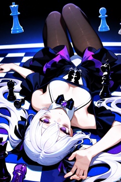 1girl, white hair, very long hair, twintails, purple eyes, bags under eyes, hair ribbon, black off-shoulder dress, layered dress, white halter leotard, leotard under clothes, sleeveless, wing collar halter, bowtie, black pantyhose, breasts bow amethyst ornament, lying, chess, chess piece, chessboard,, (masterpiece, best quality, extremely detailed), perfect composition,