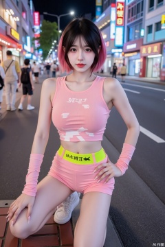 A Chinese beauty actress exudes a playful and fashionable charm in this captivating photograph. Set against a vibrant modern urban street with neon lights flashing and pedestrians bustling about, she poses in a pink sports-style tight shorts and sleeveless top that reveal her healthy tan skin and toned figure. The top features an exaggerated white brand logo and is paired with a bright yellow sports belt, full of energy. Her raven-black short hair is dyed pink, perfectly blending with her sporty style. Her bright orange lipstick adds a splash of color to her overall look. With a playful smile on her lips, she kneels on a pavement brick, her slender legs bent into a lively posture. Her lively gaze draws the viewer's attention to her white sports shoes, adding a touch of youthful vitality to her overall appearance. The image captures the essence of playful and fashionable modern femininity. Ultra HD quality, photography, extreme_detailed, ultra_realistic.