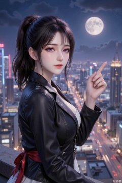 In the bustling cityscape at night, a girl in a black leather jacket sits quietly on the edge of a high-rise rooftop, gazing down at the illuminated city. Her black hair is tied into a high ponytail, the ends slightly curled and lightly swaying in the night breeze. Her fringe neatly falls over her forehead, her slightly furrowed brow revealing a hint of coolness and determination. Her purple eyes are as deep as the night sky's most distant stars, reflecting the city's lights within her pupils. Her long lashes cast faint shadows under the moonlight.