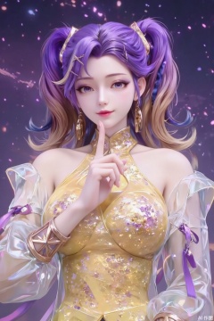 Against the backdrop of a vast starry sky, a girl in a yellow Chinese practice outfit stands quietly, exuding a unique charm and personality. Her purple hair is tied into two high ponytails, the ends slightly curled and shimmering with a soft glow under the starlight. Her fringe neatly falls over her forehead, slightly covering her slightly furrowed brow, which reveals a hint of defiance and determination. Her blue starry eyes are deep and mysterious, with countless stars seemingly twinkling within her pupils. Her long lashes, feather-light under the starlight, flutter slightly, adding a touch of dreamy charm.