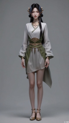 A beautiful woman, full body photo. Long black hair. Hair on the temples. Hair accessories. Earrings. Necklace. Ancient clothing. Hand over. Belt. Long sleeves. Brown eyes. Long eyelashes. Pearl eye shadow. A faint smile. Show your legs. Tall. Long and slender legs. Exquisite hands. Single mouth flat shoes. Grey background. Simple background.