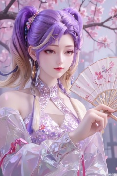 In a pink cherry blossom grove, a girl in a light purple kimono stands quietly beneath a cherry blossom tree, exuding elegance and mystery. Her purple hair is tied into two high ponytails, the ends slightly curled and lightly swaying in the breeze. Her fringe neatly falls over her forehead, her slightly furrowed brow revealing a hint of gentleness and contemplation. Her amber eyes are warm and deep, as if reflecting the falling cherry blossoms within her pupils. Her long lashes, highlighted by the petals, appear exceptionally soft.