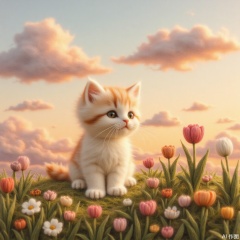 sitting, flower, outdoors, sky, cloud, no humans, animal, traditional media, cat, sunset, field, animal focus, whiskers