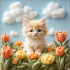 blue eyes, flower, sky, cloud, blue sky, no humans, animal, cat, cloudy sky, yellow flower, photo \(object\), animal focus, picture frame, orange flower, tulip