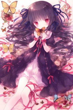 1girl, loli, black hair, dress, long hair, ribbon, butterfly, hair ribbon, red eyes, blush