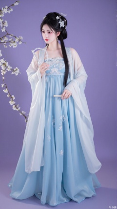 The image shows a young woman dressed in a traditional Chinese costume. She is standing in front of a purple background with a branch of white flowers on the left side. The woman is wearing a long, flowing blue dress with intricate white embroidery and a white shawl draped over her shoulders. She has long dark hair styled in a half-up, half-down braid with a flower crown on top. Her makeup is done in a dramatic style with dark eyeliner and red lipstick. She appears to be holding a white fan in her right hand and is looking off to the side with a serious expression on her face.