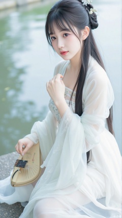 A girl with long black hair sitting by water, dressed in a white Hanfu, traditional Chinese attire, looking at the audience with a gentle expression. She wears long sleeves and plays a musical instrument, creating a serene and captivating scene. The background is blurred to focus attention on her graceful form and the tranquil waters. The lighting is soft, enhancing the delicate details of her clothing and the ethereal atmosphere.