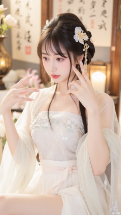 This is a highly detailed,high-resolution photograph featuring a young Asian woman with fair skin and delicate features,seated in a contemplative pose. She has long,straight black hair adorned with intricate,golden hair accessories that include a large peony flower and delicate,dangling ornaments. Her makeup is subtle,with a soft pink blush and a natural lip color. She is dressed in a traditional,flowing white robe with translucent,sheer layers that shimmer with a subtle sparkle. Her robe is adorned with small,sparkling details that add to its ethereal quality., She is surrounded by a serene,indoor setting that includes a soft,warm light that bathes her in a golden glow. The background features traditional Asian elements,including a wooden screen with calligraphy and a golden vessel,adding to the traditional ambiance. There are also pink and white flowers in the foreground,enhancing the peaceful and elegant atmosphere. The overall color palette is dominated by soft whites,pastels,and gold,creating a harmonious and tranquil scene. The image captures a moment of quiet reflection,emphasizing the beauty and grace of the subject and her surroundings.,