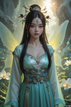 Chinese girl, goddess of summer, high-quality fantasy photos, Chinese mythology, fairy, green and white palette, a insect petal wing decoration on the face, science fiction art, optical art, aesthetics, backlight, pop art, Hanfu, texture, delicacy, light plant weaving, realistic. Lens flare bright reflection light ambient light film style fantasy light green,,in clothes