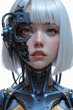 masterpiece,realistic,Camera Depth of field,cyberpunk,Camera Depth of field,glitches squares in random places,technical macro writing resembling an qr-code,(HUD elements:1.2),closeup portrait,white background,female focus,woman,beautiful,half robot face,solo,upper body,assassin,scope,(mechanical parts,:1.3) (wires and cables:2),weapon,abstract,cyberpunk,1girl,solo,white hair,short hair,tears,parted lips,bangs,portrait,crying,cyberpunk,android,crying with eyes open,blunt bangs,science fiction,mechanical parts,bob cut,lips,looking at viewer,teeth,
