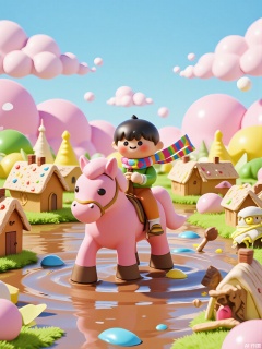 A laughing boy with a patchwork scarf rides a candy-cane pony through a field of marshmallow clouds. Below them, gingerbread houses with licorice roofs dot a landscape of melted chocolate rivers, with cotton-candy swirls forming distant mountains.