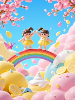 Twin sisters with matching braids balance on a rainbow bridge between floating islands: one has a waterfall of lemonade, the other a mountain of melting ice cream. Cherry blossom petals transform into origami cranes mid-flight around them.