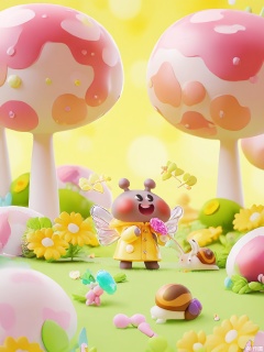 ETJ, A laughing girl in a raincoat rides a snail through a garden where flowers have candy centers. The snail's shell glitters with sugar crystals while above them, bees with honeycomb wings collect pollen from giant lollipop blossoms.