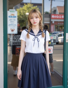 The image is a high-resolution photograph featuring a young woman standing in an urban setting,likely in Japan,based on the signage and cultural context. She has a light skin tone and long,straight,blonde hair styled in two braids. She wears a traditional Japanese schoolgirl outfit,consisting of a white short-sleeved blouse with a black sailor collar,and a pleated navy blue skirt that reaches mid-thigh. She carries a black leather handbag slung over her right shoulder. Her expression is neutral,positioned slightly below her chin.,In the background,there is a green metal door with glass panels,through which a street scene is visible. The street has a few people walking,and there are signs and advertisements in Japanese,including one for a restaurant. The overall atmosphere is casual and everyday,with a mix of modern and traditional elements. The lighting is natural,indicating it is daytime,with sunlight casting soft shadows. The image captures a blend of cultural and casual styles,typical of urban Japanese life.