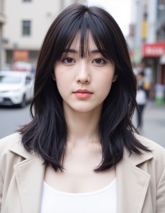 This is a photograph of a girl with fair skin and a short, straight black long hair. She has a slender build and is wearing a light jacket, over a white top. Her expression is neutral, with slightly parted lips and soft makeup. The background shows an urban street with buildings, a white car, and a person in the distance.