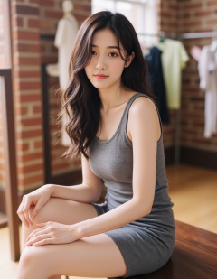 The image is a high-resolution photograph,Vibrant colors infused with mixed colorism,polaroid portrait photography,a young chinese woman with long,wavy dark brown hair and fair skin chills on a wooden bench in a sunlit room. She's rocking a snug,sleeveless grey mini-dress that shows off her curvy bod and medium-sized boobs. The backdrop features a brick wall and some hanging clothes.