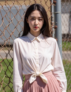 The image is a high-resolution photograph,Vibrant colors infused with mixed colorism,soft_light_style,In the image,a young woman is the central figure,standing against a backdrop of a chain link fence. She is dressed in a blouse,which is tied at the waist with a bow. The woman's is long hair,and she is wearing pleated skirt. The fence behind her is rusted,suggesting it has been exposed to the elements for some time. The woman is looking directly at the camera,her expression neutral. The image is taken from a slightly elevated angle,providing a clear view of the woman and the fence.