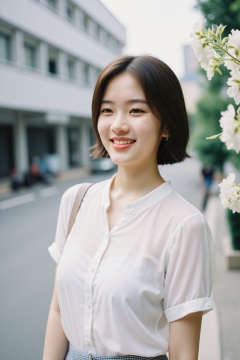 Fuji camera filter,Film photography,Color Film,Fujifilm Fujicolor 400H,film photo,Polaroid style,1girl,outdoors,shirt,short hair,solo,bag,white shirt,skirt,building,day,brown hair,depth of field,short sleeves,see-through,smile,teeth,shoulder bag,blurry background,car,motor vehicle,realistic,collarbone,red lips,lips,handbag,black hair,standing,flower,open mouth,lipstick,closed eyes,brown eyes,city,makeup,buttons,see-through shirt,street,cowboy shot,grin,sky,underwear,medium hair,shirt tucked in,road,window,parted lips,jewelry,asian,white flower,looking to the side,looking up,arms at sides,plaid,breasts,