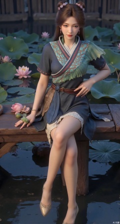 (masterpiece:1.2),best quality,The image is a digital illustration of a young woman sitting on a wooden bench in a pond with lily pads. She is wearing a long dress with design on the chest and sleeves. The dress has a high neckline and short sleeves,Holding a lotus in hand. She has long dark hair styled in loose waves and is wearing gold high heels. The woman is posing with one hand on her hip and the other resting on the edge of the bench. The background is filled with pink and white lotus flowers and green leaves. The overall mood of the image is peaceful and serene,(huge breasts:2.99),(full breasts:2.99),(Background with traditional Chinese architecture, lotus pond and pink lotus flowers:1.39),XzhihuaX,Xleidianjiangjun,Xyuenanaodai,XmeiningSMW