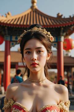 This is a high-resolution photograph featuring a young woman with a distinguished and ethereal appearance. She has long,dark brown hair styled in an elaborate updo adorned with gold and red hair accessories that resemble traditional Asian ornaments. Her skin is fair and smooth,with a slight blush on her cheeks. She has large,expressive eyes with a soft,golden hue,and her lips are slightly parted,giving her a serene and alluring expression.,She is dressed in a traditional Chinese qipao,a form-fitting dress that accentuates her slender physique. The qipao is off-shoulder,revealing her shoulders and upper chest,and is adorned with intricate embroidery and golden trimmings. She wears a delicate gold necklace with a red pendant that hangs just below her collarbone,adding a touch of elegance.,The background features a vibrant,traditional Chinese temple with ornate red and gold roofs and intricate carvings. The setting is bathed in warm,golden light,casting soft shadows that enhance the texture and depth of the scene. Red lanterns hang from the temple's eaves,adding a festive and cultural ambiance. The overall mood of the image is one of timeless beauty and cultural richness.,