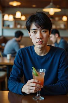 HDR photo of cinematic film still This photograph captures a young Asian man with black hair, fair skin, seated in a modern, warmly lit restaurant. He wears a blue long-sleeved top and holds a cocktail glass with a lime wedge. In the background, other patrons, including a man in a grey shirt, are seated at tables. The decor features contemporary lighting fixtures and a mix of wood and metal accents. The atmosphere is casual yet sophisticated, with a focus on contemporary design and comfort. . shallow depth of field, vignette, highly detailed, high budget, bokeh, cinemascope, moody, epic, gorgeous, film grain, grainy . High dynamic range, vivid, rich details, clear shadows and highlights, realistic, intense, enhanced contrast, highly detailed