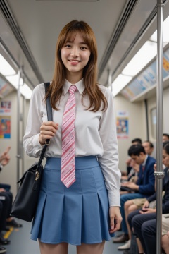 The image is a high-resolution photograph,A photograph of an girl with fair skin,standing on a subway train. She has straight long hair,and wears a white blouse,pink and white striped tie,and a blue short pleated skirt. She was carrying a black shoulder bag, with a confident expression and a smile on her face. Other passengers are seated in the background. The subway car has metal poles and advertisements on the walls.