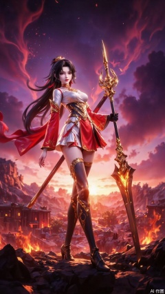 1 girl, solo, with long black hair, ponytail, scattered behind her back like a waterfall, dotted with exquisite golden jewelry, shining with magical light. Her golden sharp eyes exuded strength and determination, and her seductive and confident expression enhanced the feeling. She wore a tight white and red combat suit with intricate metal patterns that showed her toned and athlete-like figure, emphasizing her bare shoulders and a touch of waist. Her outfit is decorated with glowing reds and gold accents. Her legs were wearing black, thigh-high stockings with gold lace on them and her feet were wearing high heels with metallic shiny heels, adding a hint of elegance and seduction to her appearance. She was holding a spear with a huge spear in her right hand, which was tilted downward due to its own weight. Look directly at the audience, face the audience, get close to the audience, shoot at low angles. Set in a mysterious and dreamy environment, below is a glowing battlefield surrounded by swirling clouds of fire and light, the sky is painted with fiery red, orange and purple gradients, and the faintly glowing stardust adds to this magical atmosphere. gorgeous.