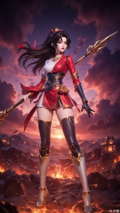 1 girl, solo, with long black hair, ponytail, scattered behind her back like a waterfall, dotted with exquisite golden jewelry, shining with magical light. Her golden sharp eyes exuded strength and determination, and her seductive and confident expression enhanced the feeling. She wore a tight white and red combat suit with intricate metal patterns that showed her toned and athlete-like figure, emphasizing her bare shoulders and a touch of waist. Her outfit is decorated with glowing reds and gold accents. Her legs were wearing black, thigh-high stockings with gold lace on them and her feet were wearing high heels with metallic shiny heels, adding a hint of elegance and seduction to her appearance. She was holding a spear with a huge spear in her right hand, which was tilted downward due to its own weight. Look directly at the audience, face the audience, get close to the audience, shoot at low angles. Set in a mysterious and dreamy environment, below is a glowing battlefield surrounded by swirling clouds of fire and light, the sky is painted with fiery red, orange and purple gradients, and the faintly glowing stardust adds to this magical atmosphere. gorgeous.