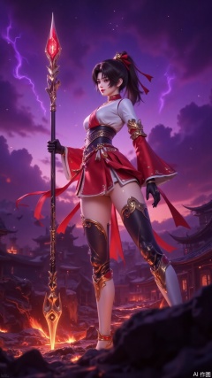 Her high ponytail is like an unruly wind, fluttering freely in the chaotic air currents. The red ornament in her hair is like a curse from an ancient demon god, exuding an intimidating aura. The long spear in her hand has patterns on its shaft that seem like the tracks of stars, recording the secrets of the universe. The spearhead glimmers with a cold and eerie light, as if it can pierce through the barriers of time and space and reach the very depths of the soul.