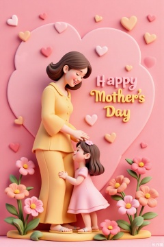 Ultra photoreal, Insane Details, 32K, 3D,Mother's Day,3D,this 3D clay-style Mother's Day poster features warm and bright colors. In the center of the image,a mother and child are affectionately embracing,meticulously crafted in clay with realistic details and overflowing love. Surrounding them are clay flowers,vivid and lifelike. In the upper right corner,"Mother's Day" is presented in artistic font,as if the letters were three-dimensional carvings,adding a festive atmosphere to the image and conveying deep maternal love.,..,3D,mother and daughter