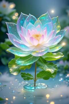 ,This is a highly detailed,digital artwork featuring a vibrant,ethereal lotus flower set against a softly lit,dreamy background. The lotus flower is the central focus,radiating a soft,pastel glow. Its petals are translucent,with hues ranging from delicate pink to soft blue and green,creating a gradient effect that gives the flower a magical,almost otherworldly appearance. The flower's stamens are golden yellow,adding a touch of warmth to the overall cool color palette. Surrounding the flower are several large,green leaves,also translucent and shimmering with a similar gradient effect,enhancing the delicate and mystical atmosphere.,<lora:shuijing_flux-000014:1>