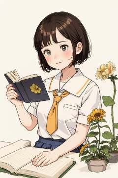 illlustration style,illustration style, 1girl, solo, holding, plant, white background, flower, book, brown hair, simple background, short sleeves, blush, shirt, school uniform, grey eyes, open book, yellow flower, closed mouth, white shirt, necktie, short hair, bangs, potted plant