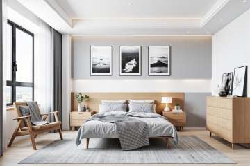This image is a high-resolution photograph of a modern, minimalist bedroom. The room features a light gray, textured wallpaper on the upper half of the wall, transitioning to a white lower half with a built-in shelf. Above the bed, there are three framed black-and-white photographs in a horizontal line, each depicting serene landscapes. The bed, positioned centrally, has a light wood headboard and is **** up with a gray duvet and matching pillows. A black and white checkered blanket is neatly folded at the foot of the bed. To the left of the bed, there is a wooden nightstand with a small lamp and a potted plant. To the right, another nightstand holds a lamp with a white shade and a small decorative item. The floor is covered with a large, light gray rug with a subtle pattern, and the walls are painted in a soft white. A wooden dresser with drawers stands against the right wall, and on top of it are a few books, a small vase with a plant, and a framed picture. The room is well-lit with natural light from a large window on the left, partially covered with sheer gray curtains. A cozy armchair is positioned near the window, draped with a gray blanket. The overall atmosphere is calm and serene