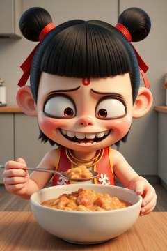nezha,nezha, 1boy, bowl, solo, spoon, double bun, forehead mark, food, hair bun, holding spoon, smile, indoors, blurry background, holding, ribbon, hair ribbon, bib, teeth, facial mark, black hair, blurry