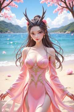 This is a highly detailed digital artwork depicting a fantastical, ethereal scene. The central figure is a young woman with long, flowing brown hair adorned with ornate, floral hairpins. She has a slender, yet curvaceous physique with ample breasts, and her skin is fair with a slight blush. Her eyes are large and expressive, with a soft, pink hue. She is dressed in an elaborate, pink, ornate gown that is intricately designed with gold embroidery and floral patterns, accentuating her hourglass figure. The gown has a plunging neckline and long, flowing sleeves that cascade gracefully, blending seamlessly with the soft, pink fabric.The background features a serene beach with soft, sandy shores and a calm, turquoise ocean. In the distance, there are lush, green hills under a clear blue sky with a few fluffy clouds. Pink cherry blossom trees frame the scene on either side, adding a touch of natural beauty and softness to the image. The overall style is highly realistic with a slight touch of fantasy, combining elements of traditional Asian aesthetics with modern digital art techniques. The lighting is soft and natural, enhancing the delicate textures and colors of the scene.