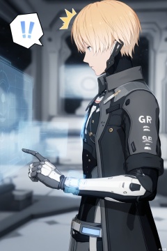 lee/(PGR),solo,short hair, blue eyes, blonde hair, gloves,jacket, 1boy,male focus,cowboy shot,holographic interface, hologram,looking at interface,finger on interface,from side,spoken surprised,blurry background