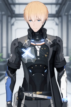 lee/(PGR),solo,short hair, blue eyes, blonde hair, gloves,jacket, 1boy,male focus,cowboy shot,blurry background