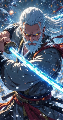 colorful,A white haired old man,holding a sparkling sword and wearing a gray robe,tied his long hair into a bun,with a nervous expression. It was snowing,with snow on his shoulders and lightning flashing on the sword. Snow and sparks danced around,and the flowing energy dispersed in all directions. The background was snowy,and from a close-up perspective,subtle light illuminated the scene. The exquisite features of keen eyesight,firm posture,decorative buckle,and flowing belt at the back created a peaceful and energetic atmosphere,blending elements of fantasy and martial arts.,from_below,dutch angle,dynamic_angle,