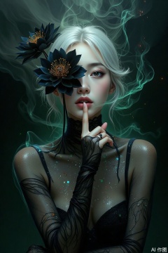 watercolor style,An Acrylic style painting that is expressive,gives it a dynamic and emotional quality. Anime art of a stylized portrait of a woman with a ethereal black and green mist surrounding her body. The mist creates a dramatic and surreal effect. A black flower,that is blooming,covering one eye,attached to the face. The woman has a cold aesthetic,complimented by her white hair. Anime art of woman draped in shadows with a lighting that enhances her unique features. The background is dark green,filled with black rose petals. Holding finger to lips,shush,shushing motion,.,Winslow Homer style,huge breasts,plbj,color-speckled background,digital-art,